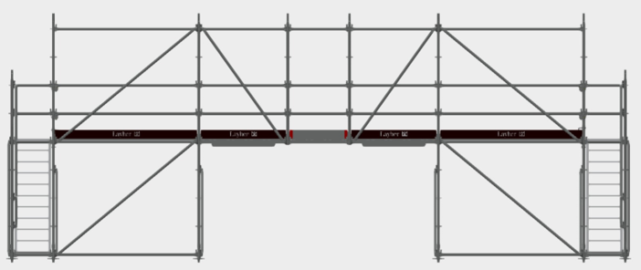 Показана конструкція, змонтована з елементів Allround, є лише прикладом конструкції, коли дві вежі з’єднуються між собою ригелями та діагоналями. Це рішення демонструє гнучкість системи – такий принцип використовується не лише в мостобудівництві, а й у багатьох інших випадках, коли потрібно перекрити проміжок без встановлення риштування по всій довжині.