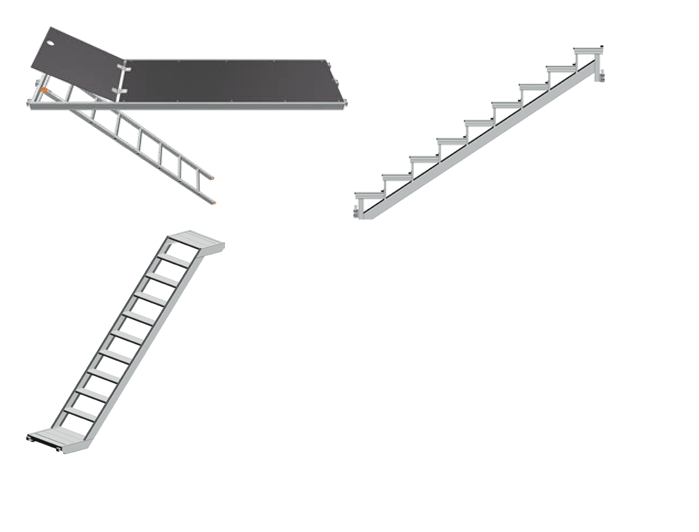 Так, окрім алюмінієвих драбин у системі Allround можна застосовувати й настили з інтегрованою драбиною та люком. Крім того, існують спеціальні елементи, які дозволяють організувати повноцінний марш сходів на основі настилів – вибір рішення залежить від потреб проєкту.